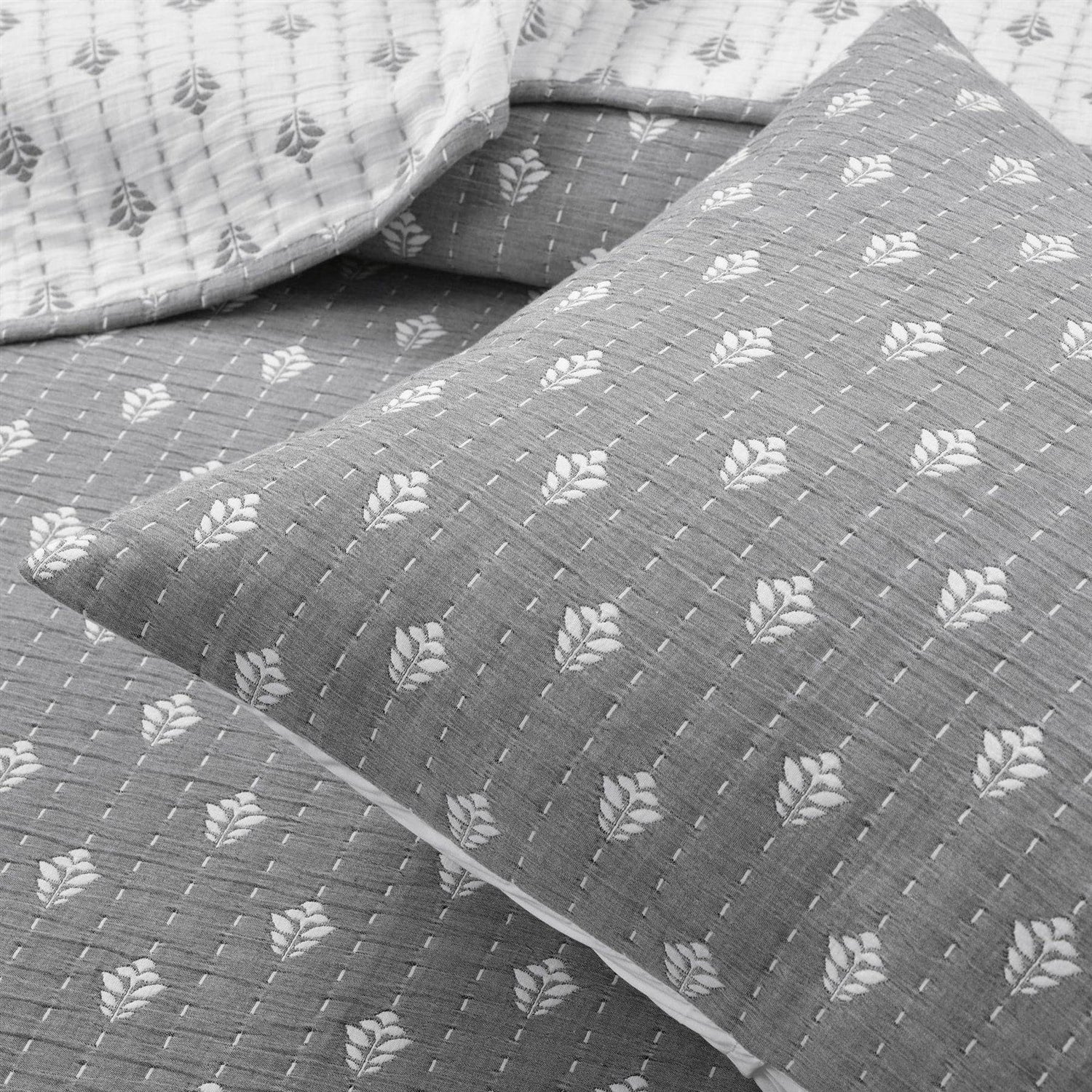 Give your bedroom a stylish upgrade with this King Size 3-Piece Cotton Yarn Woven Quilt Coverlet Set in Grey/White. This high quality affordable set is yarn dyed and woven with pick stitch leaf detail for a textured color look. Use it as stand-alone bedding or a layering piece. This King Size 3-Piece Cotton Yarn Woven Quilt Coverlet Set in Grey/Cream is STANDARD 100 by OEKO-TEX certified. The fabric, dyes, and all components have been tested in an independent laboratory and certified against a list of more than 350 harmful substances. 3-Piece Set Includes: One Quilt/Coverlet and Two Pillow Shams.